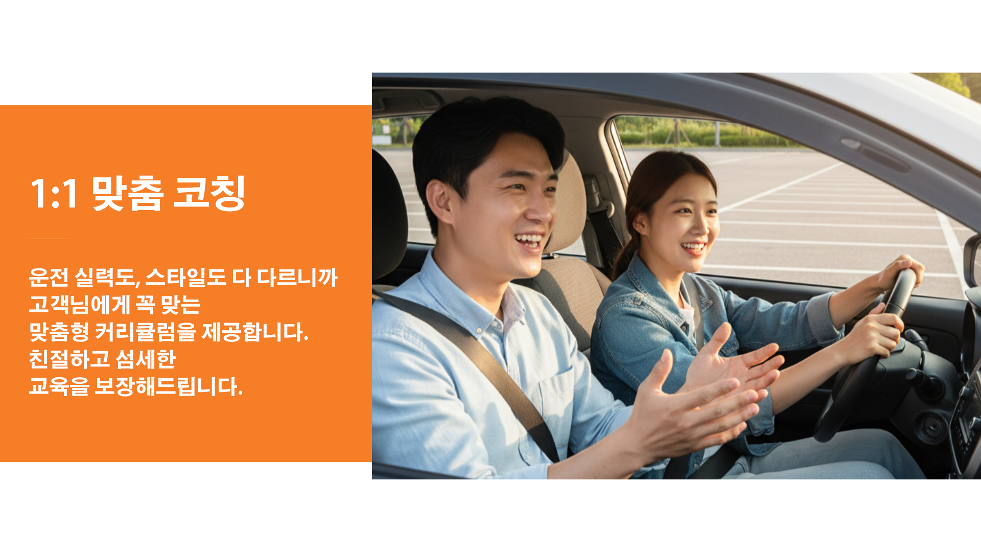 기본은 보조브레이크가 장착된 연수차로 진행되며, 원하면 자차 연수도 가능합니다. 자차 이용 시에는 안전장치와 보험 조건을 꼭 확인해야 해요.